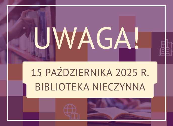 15 października 2025 r. (środa), w związku z uroczystymi obchodami Dnia Edukacji Narodowej, biblioteka będzie nieczynna. Za utrudnienia przepraszamy.